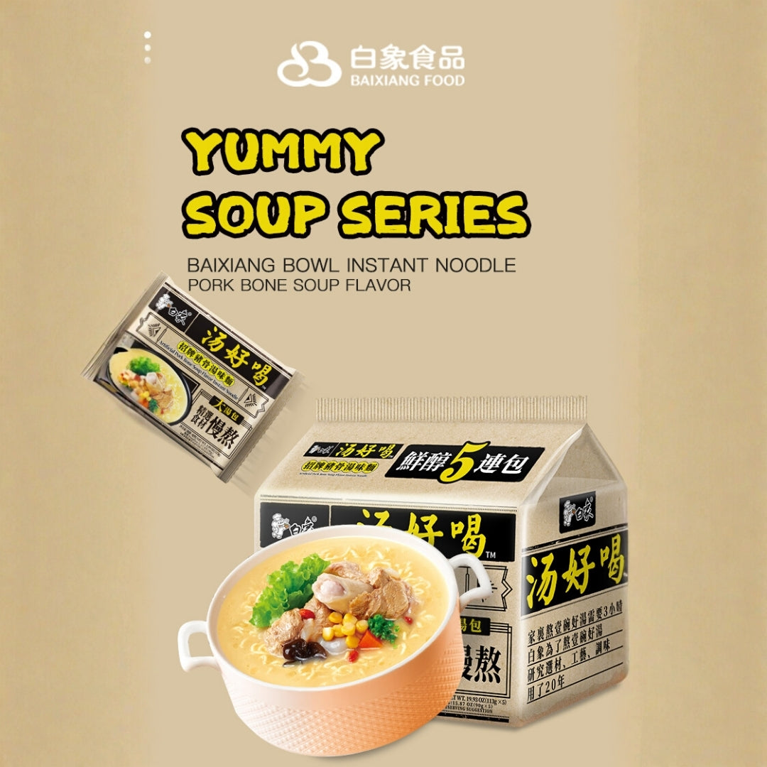 Experience three rich and satisfying flavors with BaiXiang Instant Noodles — Chicken, Pork Bone, and Spicy Beef Soup. Each variety is crafted with fine ingredients simmered for 6 hours to create flavorful broths and paired with chewy noodles that soak up every drop of taste.