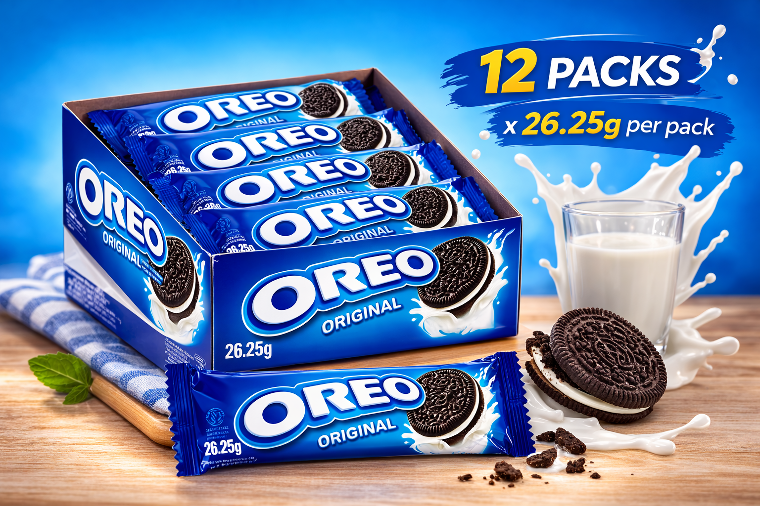 Enjoy the classic taste of Oreo Original Sandwich Cookies, now available in a convenient 12-pack box. Each pack contains the iconic chocolate biscuits with smooth vanilla cream filling, perfect for snacking anytime.
