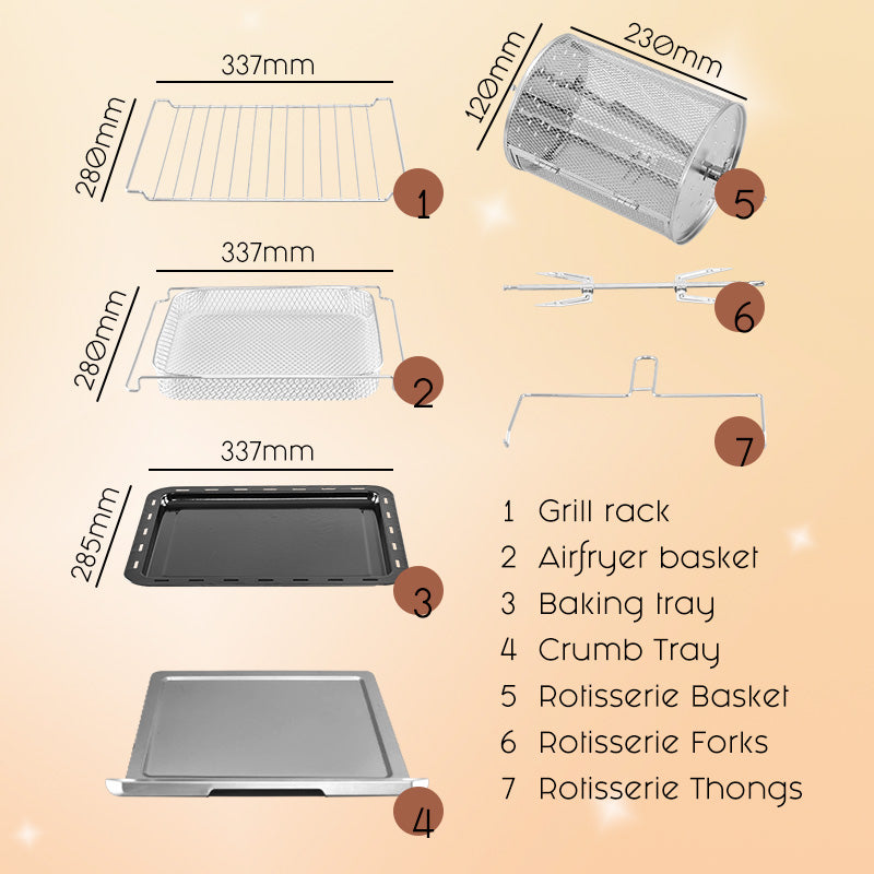 • Accessories included: Rotisserie basket, Airfryer basket, Grill rack, Crumb tray, Rotisserie bar holder, Rotisserie forks, Baking tray