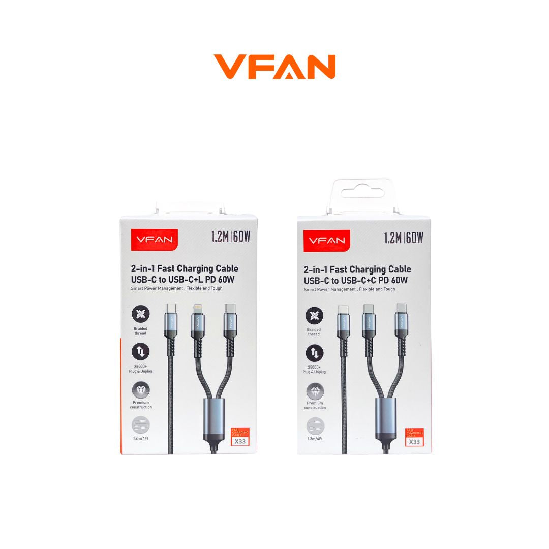VFAN X33 2-in-1 Fast Charging Cable 60W – USB-C to USB-C + Lightning PD Cable (1.2M) Multi Device Charging